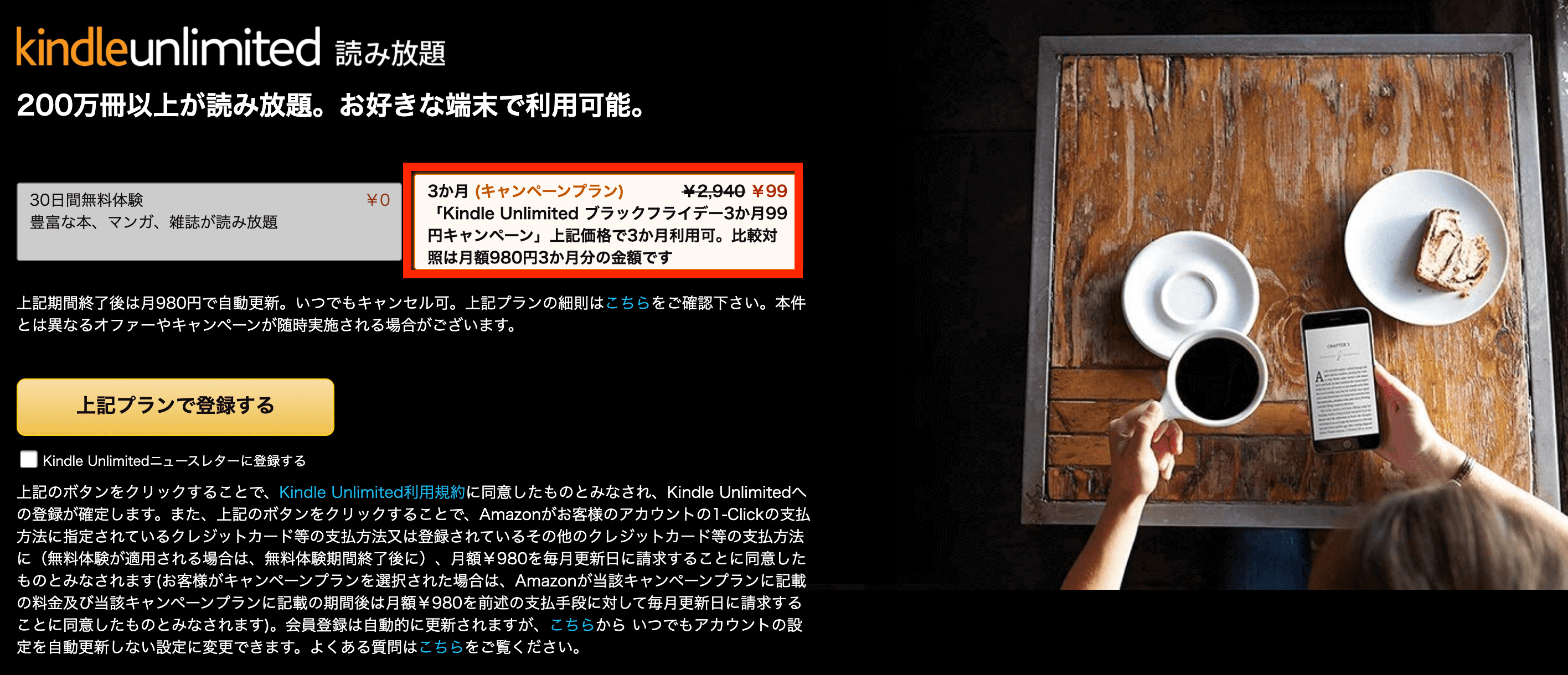 200万冊以上の本が読み放題の「kindle unlimited」が、なんと3ヶ月99円。
